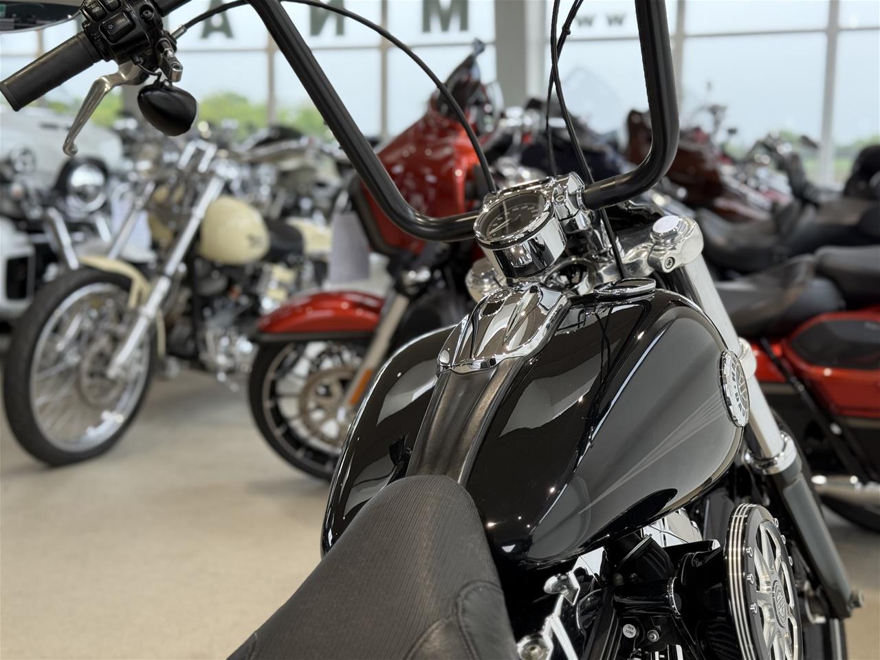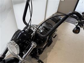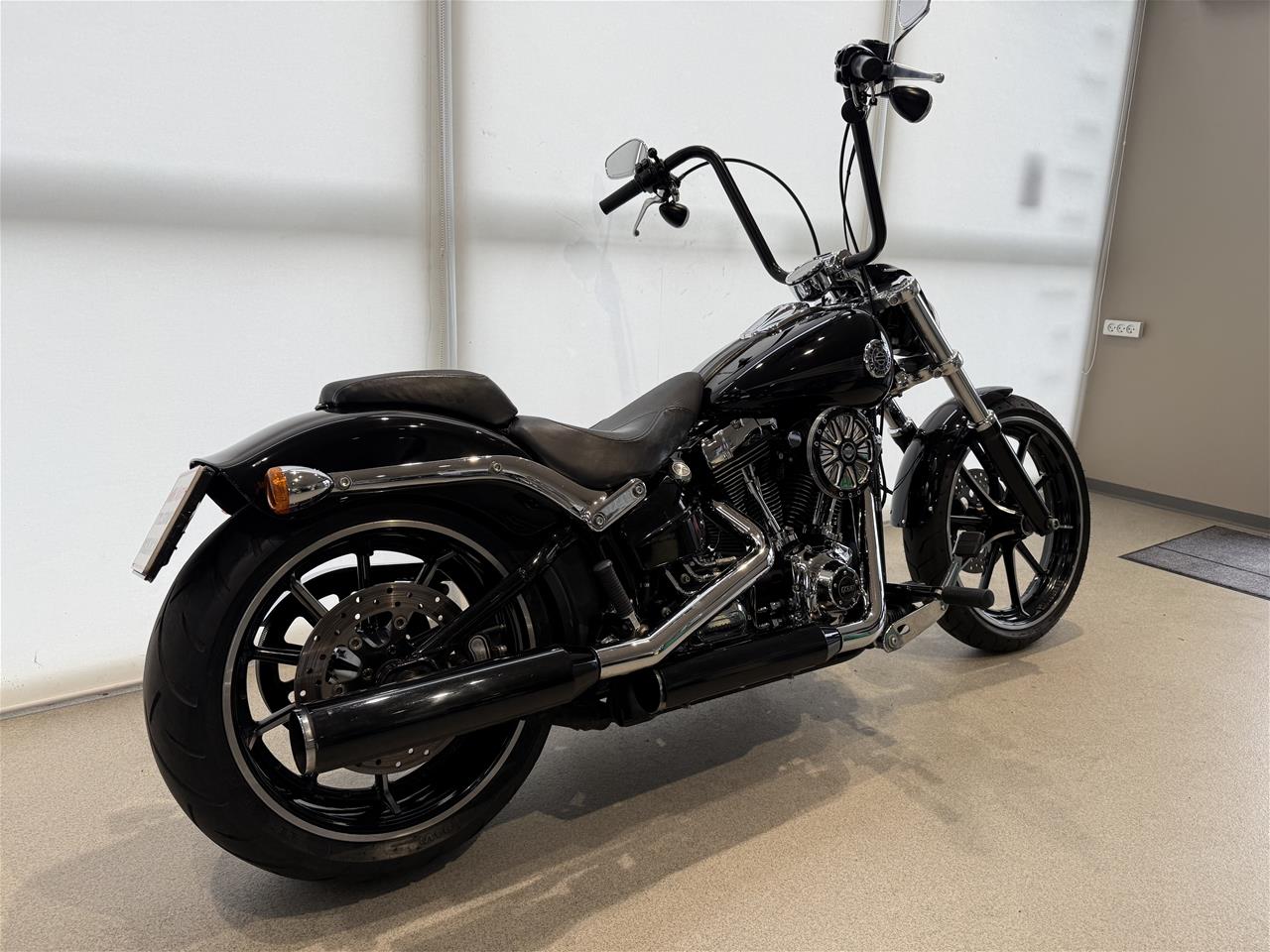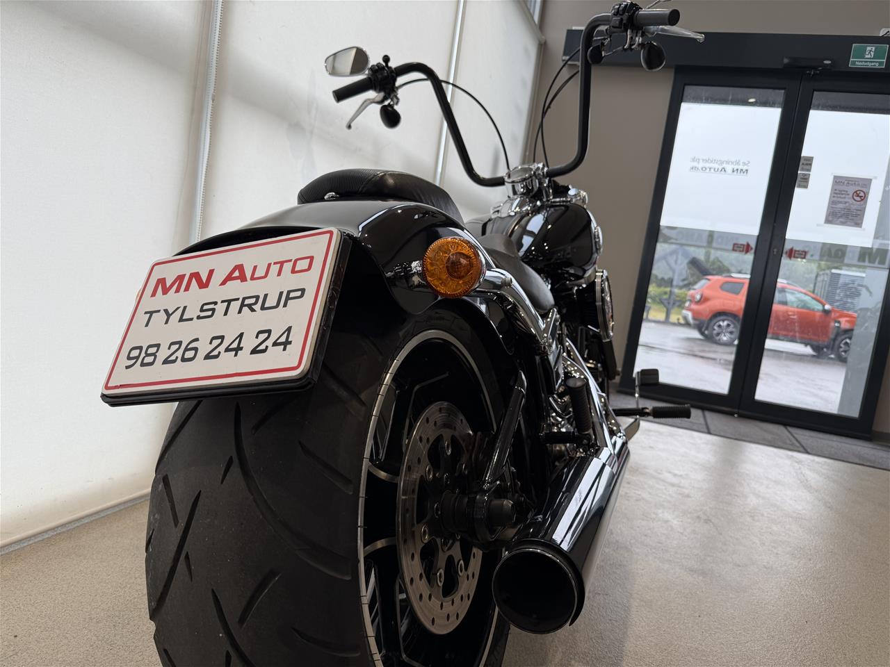 Breakout'en er udført i den flotte Custom-stil, som bl.a. indebærer bredt 240-bagdæk, stort 21" forhjul, lavt sæde, fremflyttersæt og højt styr.